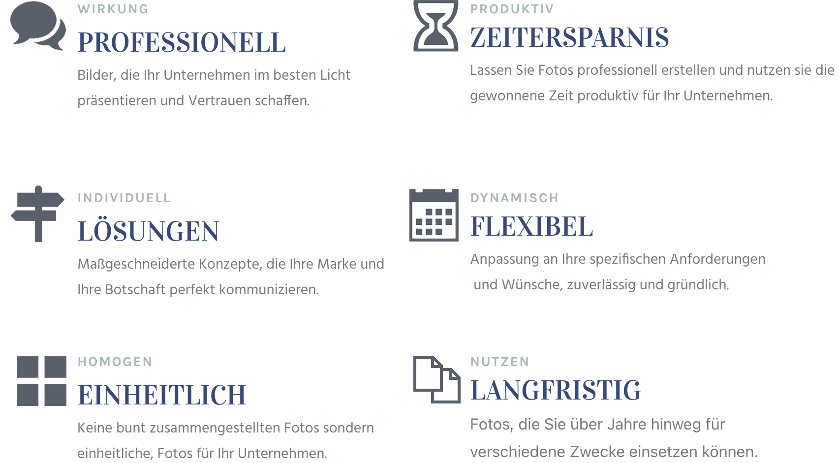 Fotos sind ein wichtiger Bestandteil der Markenidentität Ihres Unternehmens. Minderwertige Fotos vermitteln einen unprofessionellen Eindruck und können Besucher abschrecken, bevor sie sich überhaupt mit dem Angebot auseinandersetzen.Kunden könnten die Qualität des Unternehmens anzweifeln, wenn die visuelle Präsentation mangelhaft ist.